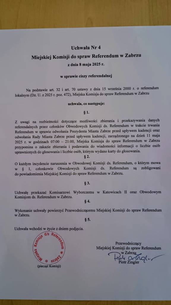 Zabrze, 9 maja 2025 r. – Tuż przed zaplanowanym na sobotę, 11 maja, referendum lokalnym w Zabrzu wybuchł poważny skandal. Jak dowiedział się portal Zabrze Alert, Sekretarz Miasta miał nielegalnie nakłaniać członków