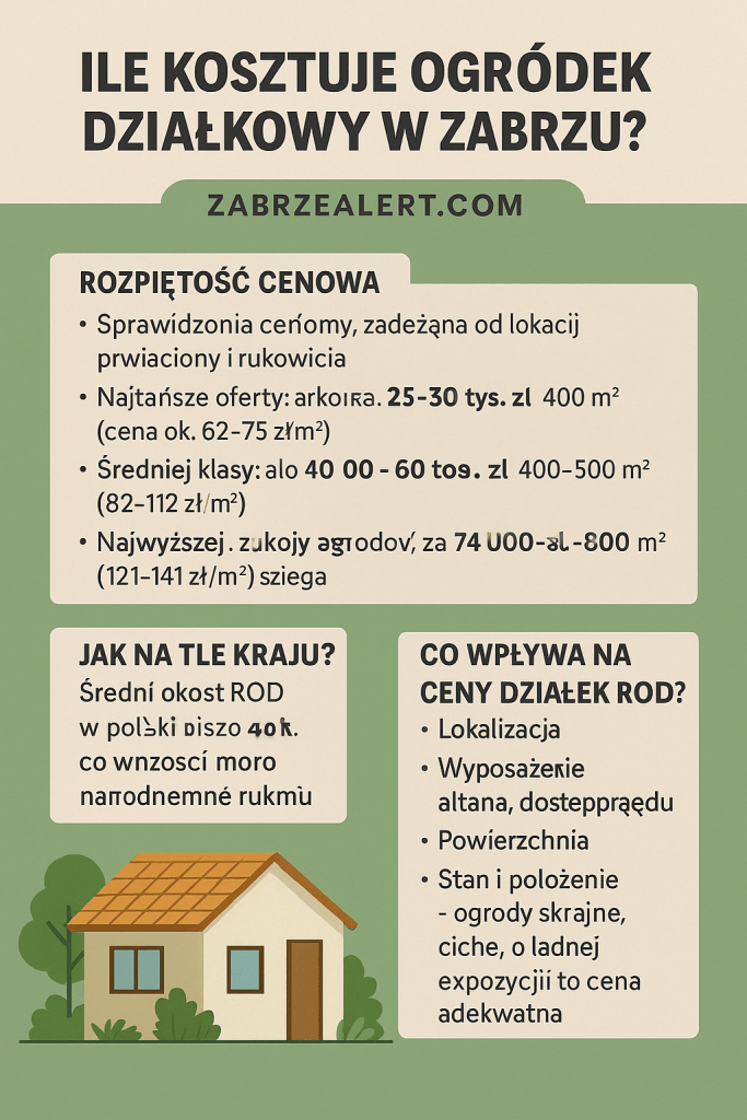 W Zabrzu oferty sprzedaży działek ROD wskazują na dużą rozpiętość cenową, zależną od wielkości, wyposażenia i lokalizacji. Przegląd ogłoszeń pokazuje, że dostępne są działki od około 25 000 zł do nawet 80 000 zł.